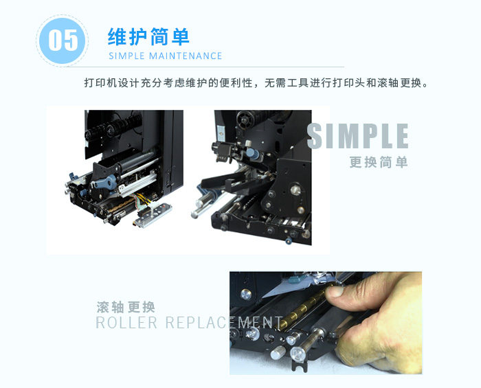 新機型采用了很多新設計方便操作人員去使用,系統(tǒng)方面沿用以確保持續(xù)運行。打印頭更換非常簡單緣于無需工具、更長接線且便于檢修。滾軸更換簡單快速緣于環(huán)扣設計;傳感器蓋的不粘膠表面設計使工程師或操作人員無需工具就能輕松清潔或更換零部件。